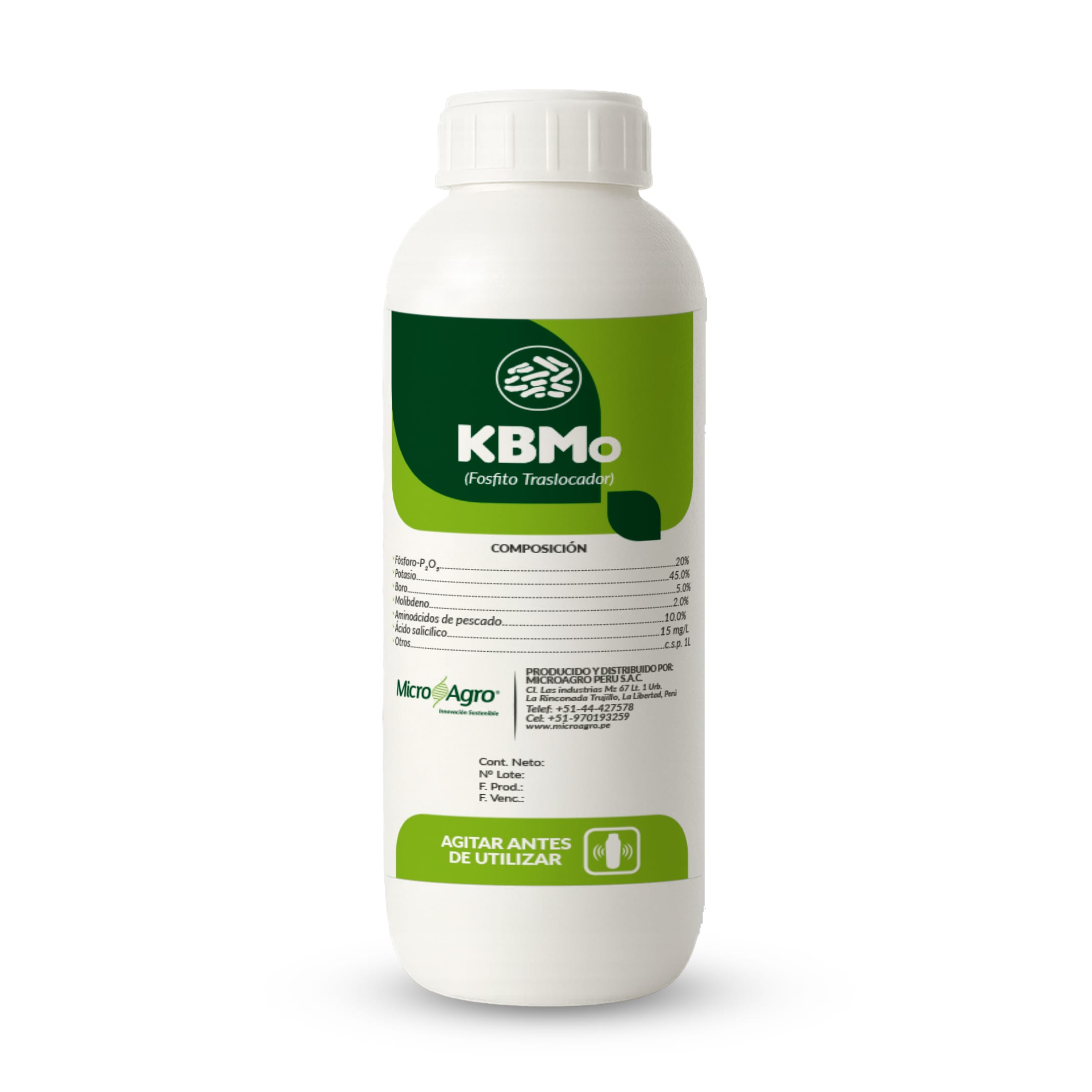 KBMo es un fertilizante foliar líquido, que por componer su ion fosfito propicia la formación de sustancias naturales de las plantas (fitoalexinas), éstos propician la creación de autodefensas y fortalecimiento frente a enfermedades fungosas, independiente de la forma de aplicación, éste posee acción sistémica ascenden- te, el contenido de Fósforo (P) y Potasio (K) tienen una gran actividad nutricional en momentos de floración, cuajado y maduración.